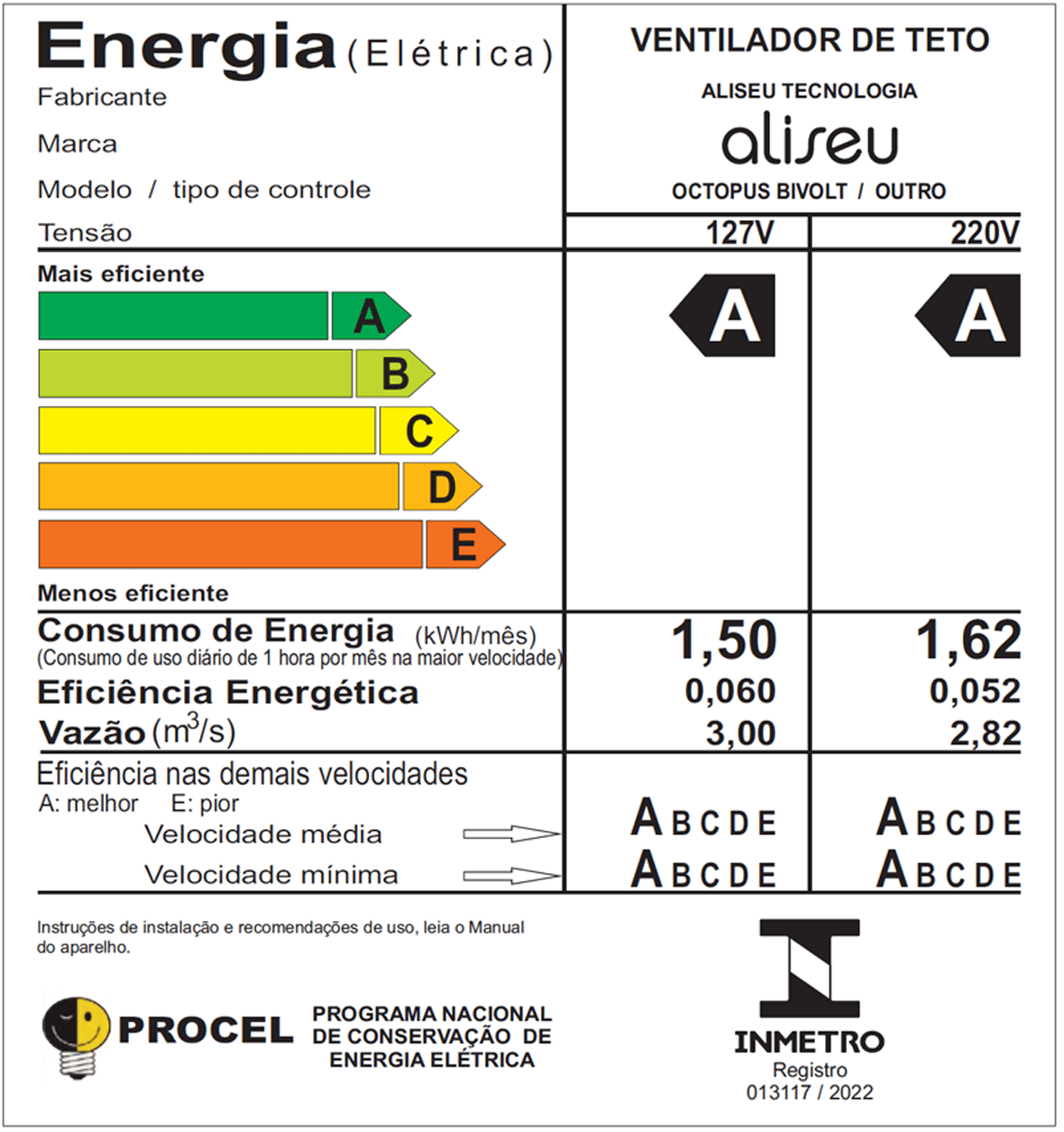 Octopus, produto exclusivo da Aliseu, o Octopus conta com motor bivolt supereficiente com selo Procel triplo A do INMETRO. Com 152cm de diâmetro e 8 pás, tem uma luminária exclusiva de LED com três tonalidades, trazendo mais economia e praticidade. Acompanha controle remoto e é indicado para ambientes com até 36m².